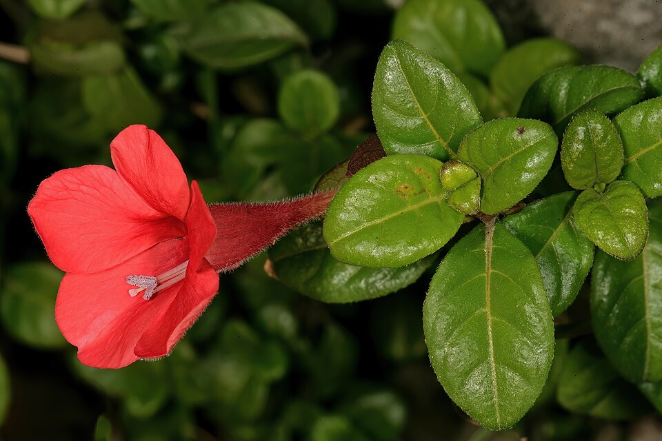 這是一種灌木,在栽培中通常高達0.7米、寬達1米;當它攀爬在附近其他灌木上時,可達約2米高。葉片光澤深綠色,呈橢圓形,邊緣整齊。大而管狀的粉紅花朵(長5厘米、寬2.5厘米),有5片不等長的花瓣。花朵位於葉腋,每朵花有兩個綠色的葉狀萼片。杯狀果實會裂開,將種子彈射離開母株。每個果實含有4粒種子。