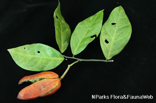 這是一種半直立灌木或樹木,高達10米,枝條下垂,樹幹和細枝有刺。葉片互生、有柄,革質葉片長橢圓形,偶爾近矛狀,乾燥時呈暗黃綠色,大小6.4–30 x 2.5–13厘米,先端鈍或稍尖。開花枝在葉腋上方有2–6朵白色羽狀花排列。花朵約2.5厘米長寬,在細枝末端葉片明顯減少。上部花瓣黃色轉暗紫色,頂端白色,而側瓣為白色。果實淺黃褐色,近圓形,大小3–7 x 3–4.5厘米,有四條垂直溝槽,內含多數種子嵌入橙紅色果肉中。種子紅色至光亮黑色,光滑,大小達6–8 x 4–7厘米。