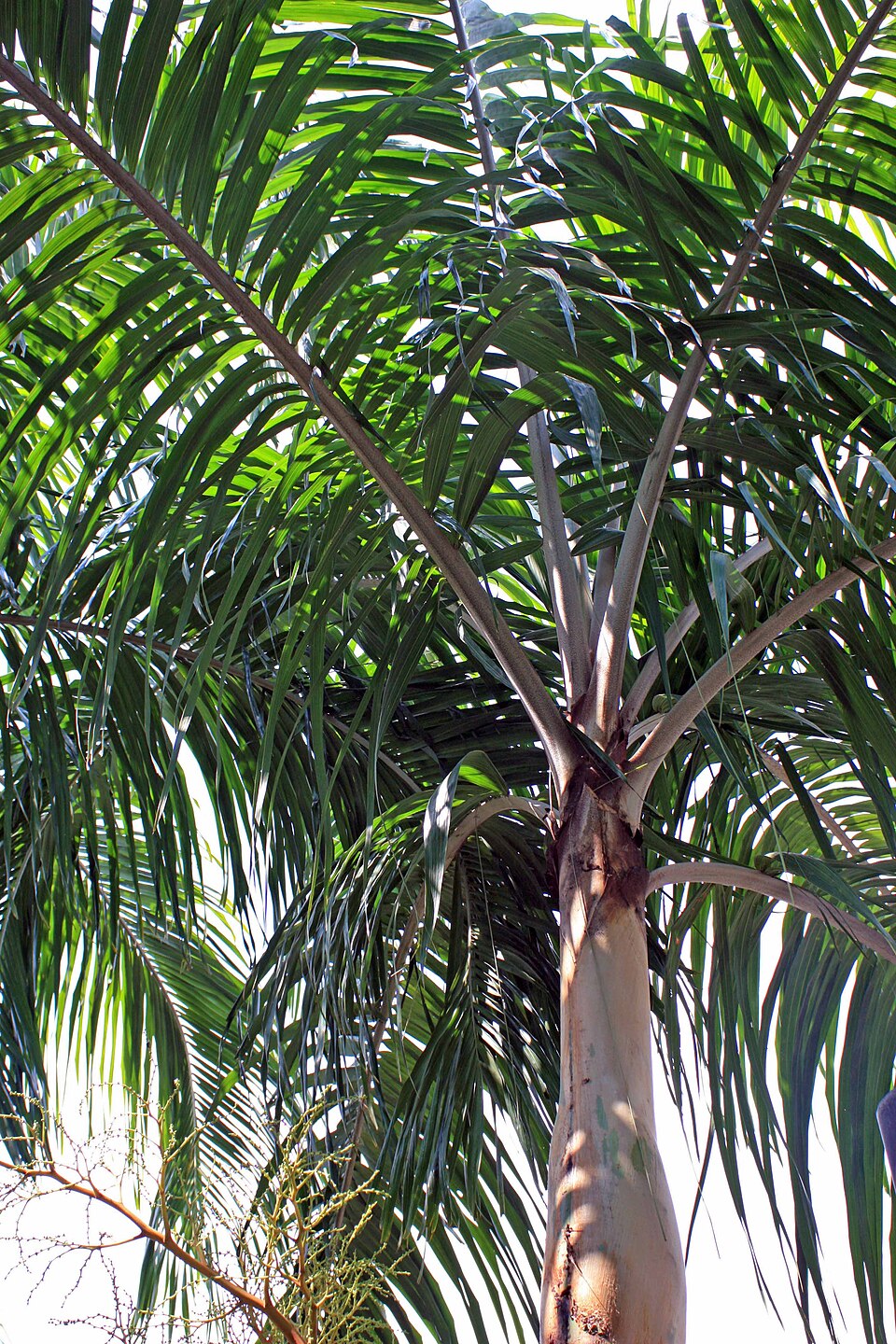 優雅、高大且羽狀的植物,具有細長灰色樹幹、綠色冠軸,以及由拱形葉片形成的優美深綠色冠部,天然生長在湖泊和河流附近的低地地區。葉片羽狀、V形、螺旋排列,大約2米長,上面深綠色,下面藍綠色,每片葉片約有100片小葉。花序白色,從冠軸下部冒出;花朵成群三朵(2朵雄花,1朵雌花)。果實卵形,約1.5至2厘米長,從紅色熟變黑,成大串漿果狀。