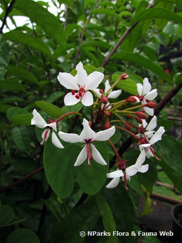 葉片單葉且較大,具有全緣,有些灰綠色,長7-9厘米,有9-11條主脈。葉尖分成兩部分,直至葉長約1/5。葉片沿莖交替排列。幼葉在下表面和葉柄上略有絨毛。花朵生於總狀花序簇中。花蕾有毛。花托長25-30毫米。每朵花有5瓣,白色、大而展開。雄蕊和雌蕊為深紅色。果實為莢狀。