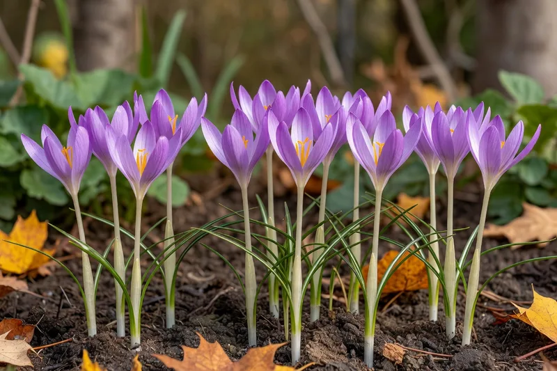 秋水仙屬是球莖多年生植物,通常有粗糙的寬帶狀葉子,這些葉子與杯狀花朵同時或之後出現。