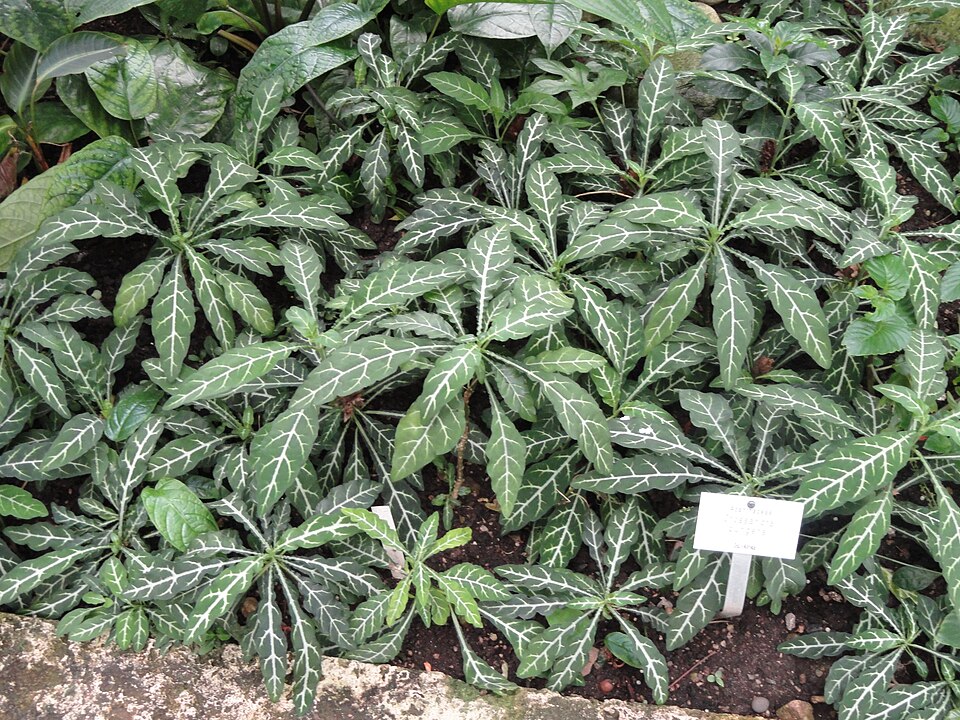 這是一種草本植物,可長到約 40-60 公分高。其葉子對生。葉片狹長橢圓形,綠色帶有白色的中脈和葉脈。苞片為綠色,並以直線形式相互重疊。花朵為淺橙色。
