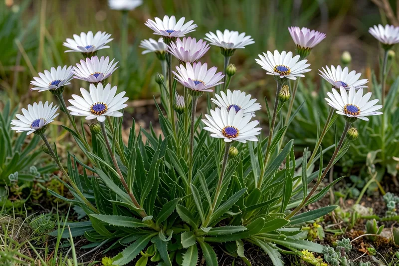 這是一種直立或蔓延的常綠灌木或亞灌木,高達1米,帶有芳香的灰綠色葉子,長達10厘米,葉子可能為線狀長圓形、橢圓形或矛狀,並且邊緣完整、部分或全部有齒;花序直徑5-8厘米,具有深藍色盤狀小花和放射狀小花,上部為白色、下部為靛藍色,在整個夏季開花。