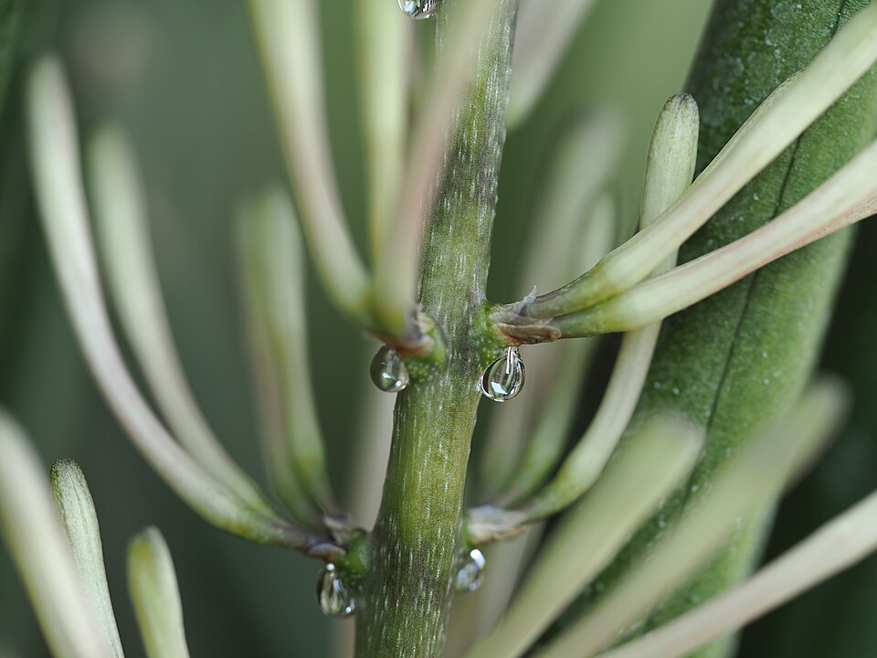 具根莖的多肉植物,具有棒狀葉片交替排列形成扇狀,高達0.9-1.2公尺,寬0.6-0.9公尺。葉片僵硬、圓柱形,漸尖並有肋紋表面(長0.6-1.5公尺,寬2-3公分)。葉片為灰綠色,帶有不明顯深綠色條紋形成條紋圖案。白色芳香花朵為管狀,有5片線狀花瓣向後捲曲(長2.5公分),長白雄蕊延伸超出花瓣。花朵沿著穗狀花序呈漩渦狀排列,實際上是總狀花序。