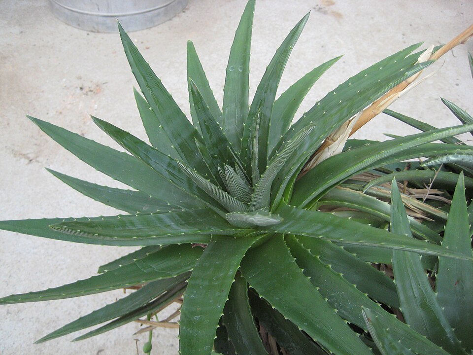 密集的蓮座狀線形多肉葉片。厚實、多汁的葉片狹窄且線形。葉緣布滿尖刺,常有黑色尖端。葉片背面有銀色條紋圖案。此種植物產生穗狀花序,由黃色至黃橙色、管狀花朵組成(1.3 公分長)。
