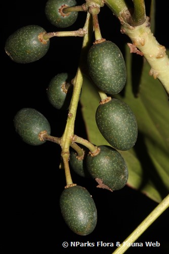 這是一棵高達 21 公尺的樹,樹圍高達 1.2 公尺,枝條頂端覆蓋著樹脂。它的葉子螺旋排列,有長柄,葉片革質,呈長圓形或橢圓形,尖端,綠色,大小為 7–31 乘 3.8–18 公分。它的花朵在葉腋處的 3–13 朵花序上發展。它的白花直徑 1.3 公分。它的果實是核果,呈橢圓形或長圓形,灰藍色帶有綠色油質果肉,大小為 1–2 乘 0.8–1.2 公分。它的種子約 1 公分長。