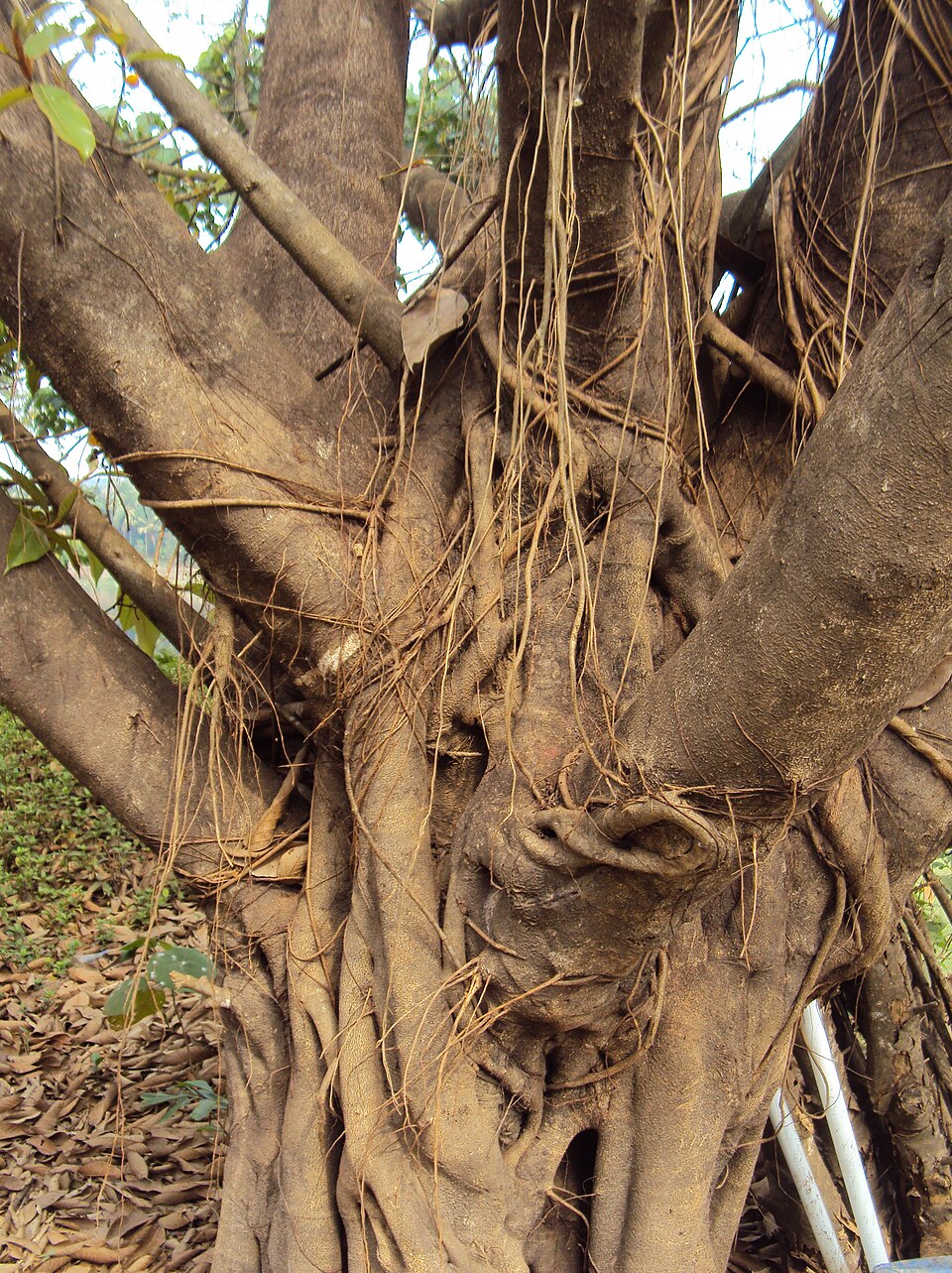 它是 strangler fig tree,高達 35 公尺,擁有豐富的自由懸掛氣生根。當受傷時,植物會分泌白色的粘性乳汁。