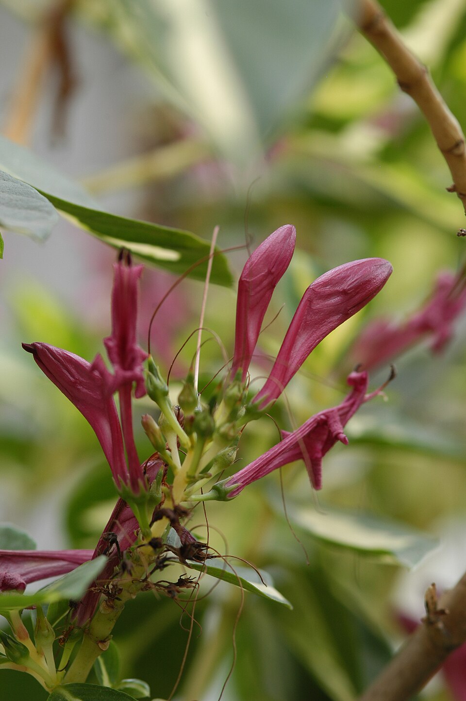 這是一種常綠灌木,高約 0.6 至 1.2 公尺。它的葉子吸引人,呈橢圓形到橢圓形,綠色,並沿中脈有白色和粉紅色的斑紋。它的花朵成簇生長,管狀,呈紫紅色。