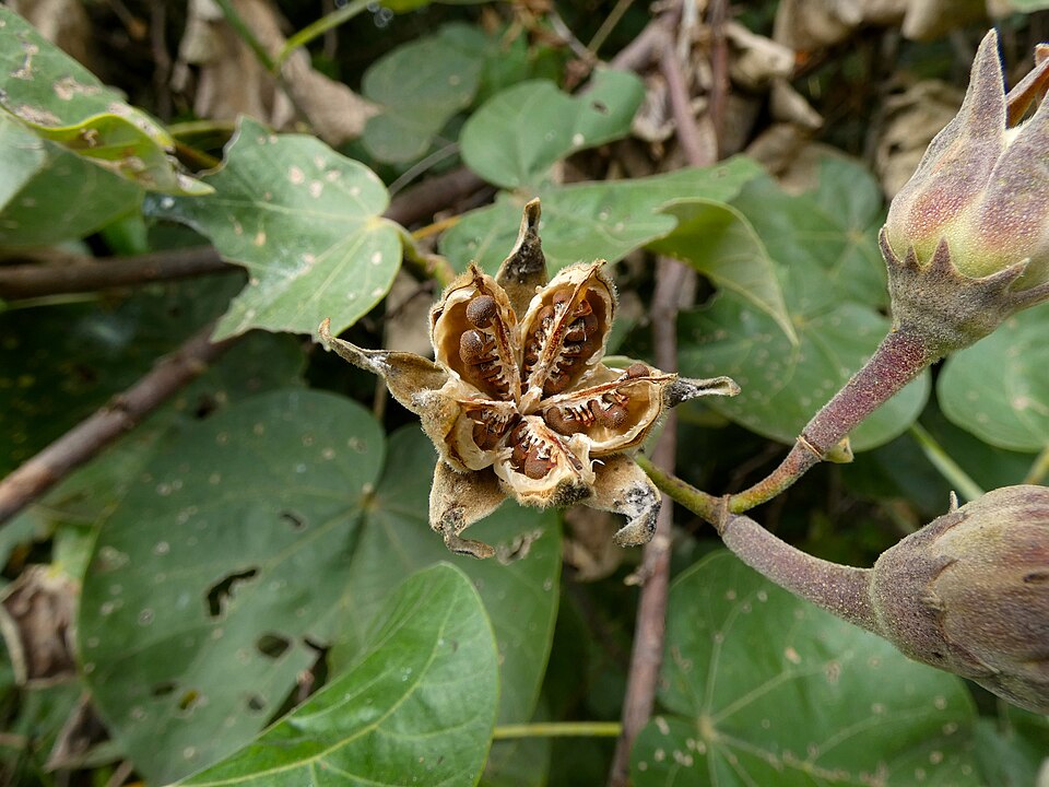 小型灌木狀樹木,在肥沃土壤中可高達15米。樹冠擴展至圓形,具有許多枝條。葉子心形,尖端,邊緣細鋸齒,上方深綠色,下方覆蓋細白毛,沿莖螺旋排列。在少花的花序中產生,每朵花大,漏斗形,明亮的黃色帶紫色眼,約上午9點開放,下午變成暗橙色和暗粉色,然後約下午4點關閉並掉落。萼片形成尖端杯狀。開花繁茂。圓形爆裂莢果,成熟時為褐色,分裂成5部分散佈許多小腎形種子。