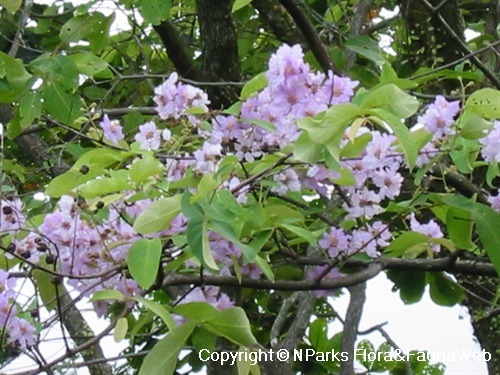Tall tree with grey fibrous bark, able to grow up to 20 - 30 m tall. Oblong-lanceolate to ovate leaves, measuring about 8 - 18 cm long and 4 - 6.5 cm wide, petiole measuring about 4 - 8 mm long, underneath of leaf surface tomentose. White flowers, sometimes pale pink, with crinkled petals and borne in panicles measuring about 8 - 20 m long, sepals measuring about 3 - 4 mm long, numerous stamens clustered in the centre, ovary densely tomentose. Fruit is a capsule, globose to ovoid-oblong in shape, measuring about 1 - 1.5 cm by 0.8 - 1.1 cm. Seeds (including wings) measure about 6 - 7 mm long.