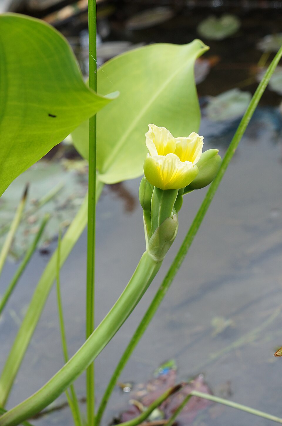 It is an erect, perennial, aquatic herbaceous plant, growing up to 50–120 cm tall. The leaves are lime-green or bluish-green, smooth and hairless and arranged in a basal rosette. The leaf blades are either ovate or near circular in shape, with 7–17 main nerves and numerous secondary nerves running in parallel. The petioles (leaf stalks) are up to 85 cm long, thick and triangular in cross-section with many air chambers. The inflorescence is an umbel (a type of inflorescence in which the flowers arise from a common point on the inflorescence stalk) with 3–15 yellow flowers with cream margins. The peduncle (inflorescence stalk) can grow up to 90 cm in length, standing erect when flowering and curving downwards when fruiting. The flowers open in the morning only for a few hours. The fruit is compound capsule (a type of dry, dehiscent fruit), which is globose or broadly ellipsoid in shape and contains numerous dark-brown, horseshoe-shaped seeds. The seeds are propagated by water.