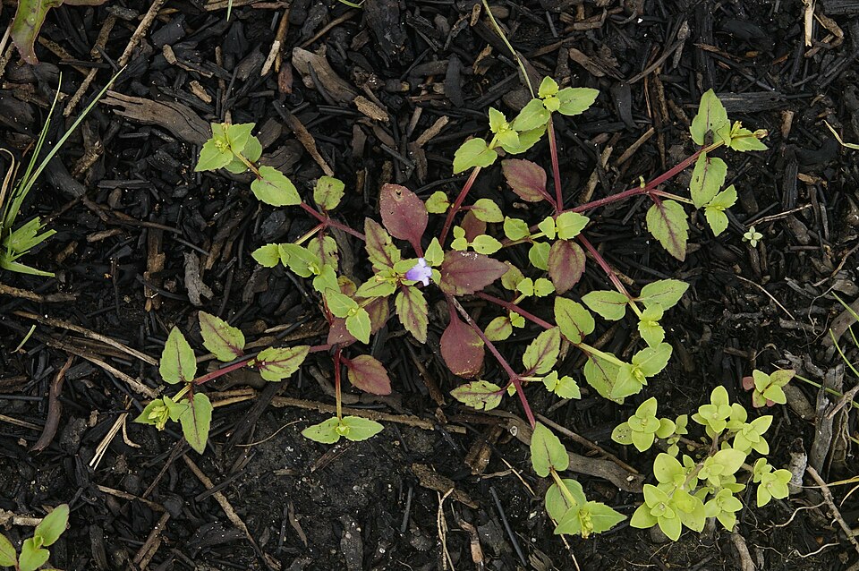 Annual herb with a creeping or erect growth habit. Triangular to ovate leaves have a toothed leaf margin. Stipules (tissue at the base of the leaf stalk) are absent. Leaf blade is 1-2 cm long and 0.5-1.1 cm wide. Purple tubular flowers are bilabiate, having a 2-lobed upper lip and a 3-lobed lower lip. The lobes are mostly white and the throat is yellow, both having purple markings.