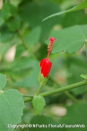 It is a shrub, with slightly hairy branchlets, up to 1 m tall. Its alternately arranged, stalked leaves are broadly cordate to ovate-cordate, tri-lobed or with smooth margins, 6-12 cm long and 2.5-10 cm wide. Its red, tubular flowers are borne singly at the leaf axils, about 2-3.5 cm long and 5-petaled. Its fruits are fleshy capsules that ripen to bright red and usually contain 3-4 seeds.