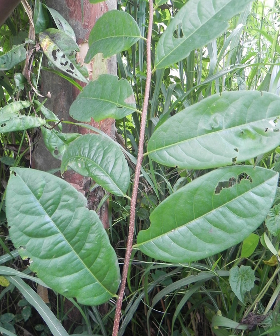 It is a tree, up to 30 m tall, with single or multiple trunks. Bark peels irregularly revealing new barks in shades of orange-brown. Leaves are papery (chartaceous), elliptic to obovate (3 – 17 cm long and 1.8 – 8.3 cm wide) and in alternate arrangement. Leaves are green on the upper surface and pale green on the lower surface. There are 6 – 12 pairs of secondary veins which are visible on both sides of the leaves. They form faint loops towards the leaf margin. Leaf tip is acute to apiculate while leaf base is cuneate to rounded. Petiole is short (0.35 – 1.1 cm long) and is channelled on the upper surface. Stipules are triangular to lanceolate (0.2 to 0.45 cm long), falling off early and leaving a semi-circular stipular scar on the twig. Leaves dry characteristically dark brown. Flowers are dioecious where the male and female flowers are borne on separate individuals. Male flowers are borne in clusters of 2 – 28 on flower stalks (up to 7 mm long). Each male flower comprises of a large flattened disc, stamens, filament (0.8 – 1.5 mm long) and oblong anthers. Female flowers are borne in clusters of 1 – 7, on flower stalks (up to 2.2cm long). Each female flower comprises of a disc (1.8 – 2.6 mm) and stigma (1.5 – 2 mm long) which is bifid at tip. Fruit is an almost globular (0.9 – 1.2 cm diameter) capsule produced singly or in pairs. The fruit turns from green to brown and split into 3 parts as it matures. Seed is triangular (3.5 – 5 mm long and 2.8 – 4 mm wide) with a thin translucent bluish purple sarcotesta.