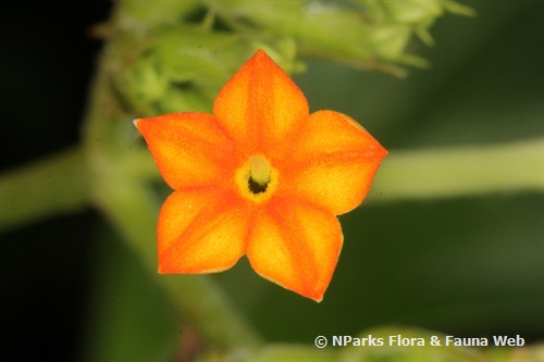 It is a climbing bush reaching up to 1 m height, and has hairless, lenticellate branches. Its opposite , stalked leaves have leathery blades that are usually oblong to lance-shaped with a pointed tip, bright green above, green below, 6.4–8.9 by 1.3–4 cm, and have 5–6 pairs of veins that are hairless or covered with soft hair. Its flowers are orange-red, covered with soft hair that are yellow at the mouth, and arranged in clusters at the end of flowering branches. Its fruit is oblong, green, 1.3 cm long, and has tiny seeds.