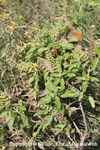 Small herbaceous plant with erect growth habit. Gland-dotted on both surface. Small, white to light blue flowers (1 cm long) are composed of an upper and lower lip, the lower lip being slightly larger. White stamens are slightly longer than the lower lip. Terminal inflorescence is composed of flowers in whorled arrangement. The flowers are similar to that of Ocimum basilicum, but the upper lip of the calyx is shorter (2 - 3 mm long compared to 4 - 6 mm long). The inside of the calyx is also densely hairy above the fruits. Small, 1-seeded fruits are known as nutlets. In water the nutlet-wall produces a thick white cover of slimy threads within several minutes.