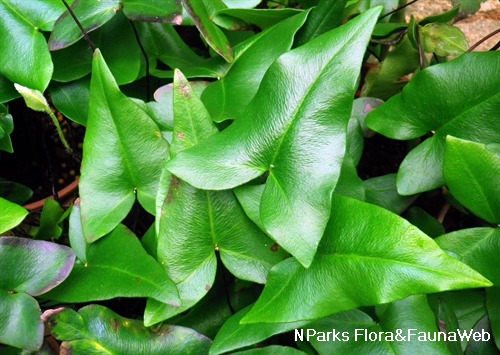 Small clumping fern to 20 cm tall. Fronds sagittate to narrowly cordate, dark green, often with bluish tinge if growing in deep shade; rachis dark brownish black. Undersurface of fronds with sparse hairs. The heart-shaped fronds do not produce spores, while the arrow-shaped fronds bear spores.