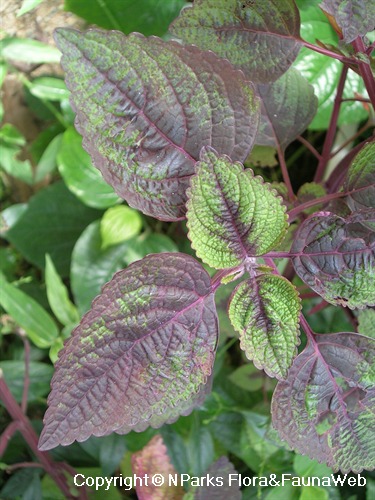 Annual herb up to 2 m tall. Leaves are ovate (egg-shaped) to round with a toothed leaf margin (2-13 cm long, 1.5-10 cm wide). They are arranged in pairs with alternate pairs being perpendicular to one another. White to purple-red flowers are tubular and 2-lipped. They occur in pairs along a spike-like (racemose) or branched (paniculate) inflorescence. The fruit is composed of 4 approximately round nutlets which are grey-brown to black-brown (1-2 mm wide). The nutlets have a netted surface and remain inside the calyx (the outermost layer of the flower).