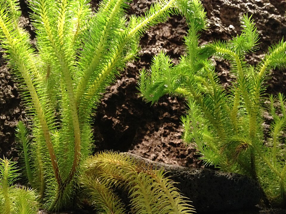 A type of fir clubmoss, one of the oldest "living fossils" of fern-allies, with fossils dating back to the Carboniferous period (~360 million years ago). Herbaceous with creeping rhizomes, arching to 20cm height and trailing up to 75cm length. Fronds trailing, tufted, arched or nodding towards tip, bifurcating (dividing into 2) as they lengthen. Stems thin (4mm across), brownish when older. Frondlets pale to yellowish green, narrowly-linear and bristle-like, whorled at 60-90° along stem axis. Bulblets (gemmae) formed at base of upper fronds during end of each annual growth cycle.