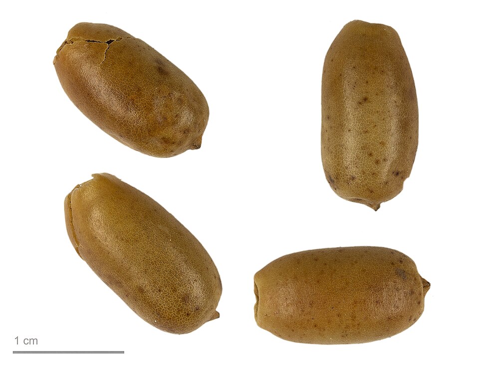 It is a clustering palm, up to 12 m tall, and often forming thicket. Cut stem produce clear yellowish sticky substance. Leaf sheath is persistent 1 – 2 m below crown. Leaves are arching (2 – 3.5 m long) with reddish-brown fibrous leaf sheath and comprises of 80 – 130 leaflets on each side (28 – 45 cm long and 2.2 – 3.6 cm wide). Leaflets near the base are modified into spines (3 – 9 cm long) and are irregularly arranged. The bracts enveloping the male and female inflorescence are green-yellow and split open 1 or 2 times between margins when mature. The male inflorescence is erect (17 – 30 cm long) and comprises of cream-white male flowers crowded on the stalk. Female inflorescence is erect (about 60 cm long) but slowly becomes pendulous as fruits are developed. Fruit is ovoid, and matures yellow – orange (1.3 – 2 cm long and 0.7 – 1.3 cm wide) with sweet flesh (about 0.1 – 0. 2 cm thick). Seed is obovoid with rounded tip ( 1.2 – 1.4 cm long and 0.5 cm wide).