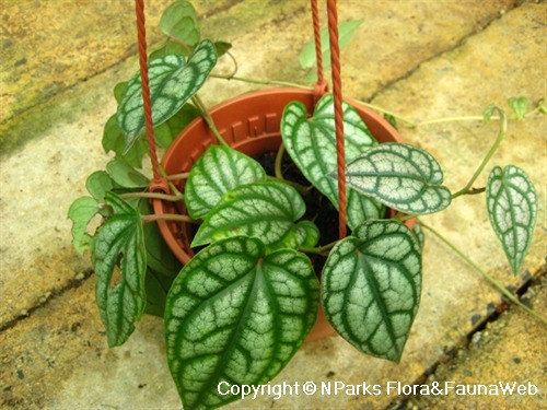 It is a herbaceous climber. Its leaves are light green and heart-shaped. Areas along the veins are dark-green. Its inflorescence is borne opposit to the leaf. The male inflorescence is slender and grows about 5-8 cm long. The female inflorescence is about 1.5-2.5 cm long. Its fruit are globose drupes.