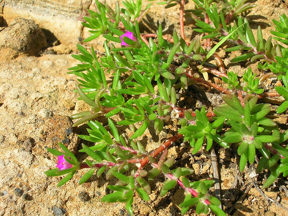 Herbaceous, succulent, creeping sub-shrub with low and compact growth habit, up to 2cm height. Leaves oval with rounded tips, sessile (no stalk), small (0.7cm long by 0.5cm across), fleshy and Sedum-like , reddish-purple-green if exposed to full sunlight, reverting to greenish if placed in shadier conditions. Solitary, around 2cm across, 5 pink petals, with dark pink hairy stigmas and anthers (which may be covered with yellow pollen), with whitish stipular hairs at nodes and beneath flowers. Not observed in Singapore.