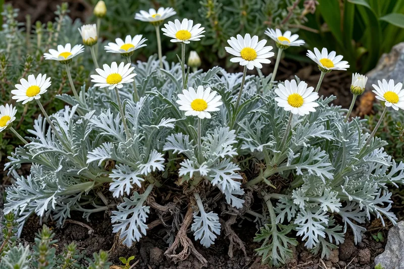 木質基底的蔓延性多年生植物,高達30厘米,葉子銀色並分為狹窄段,開有單株黃心白雛菊,位於葉子上方。
