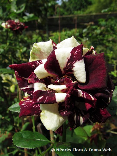 一種雜交茶香玫瑰灌木,直立生長,高達1米,寬達60厘米。光澤深綠色羽狀複葉,每片小葉為卵形,邊緣有鋸齒。中等大小、鮮艷的花朵,直徑約7厘米,深紅色帶黃色條紋,輕微香味。