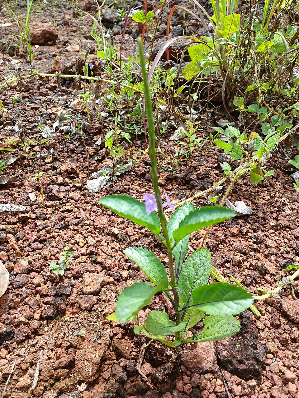一種木本直立灌木,具有長而突出的穗狀花序。淺綠色對生葉片約為橢圓形至卵形(5 cm 長,3-4 cm 寬),葉緣有不等大小的鋸齒,葉片略向內捲曲。鮮紅色漏斗形花朵有5個不等大小的花瓣和白色喉部(1 cm 寬),花朵排列在15-25 cm 長的頂生穗狀花序上(花序位於莖尖,有無梗花朵沿一根主軸排列)。每次僅約3-6朵花開放,持續一天後由新一批替換,穗狀花序以此方式開花數週。乾燥不開裂的果實稱為小堅果,一種單籽的小堅果狀果實,由多節果實破碎成單籽片段形成。